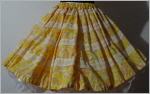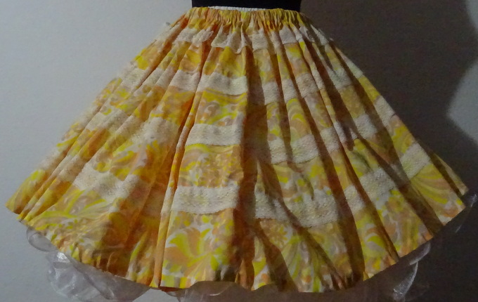 weitschwingender gelbgemusterter Tellerrock4-stufigjede Stufe verziert mit 4 cm breiter weisser Spitze3 cm breiter Gummibundpflegeleichtes Materialguter Zustand