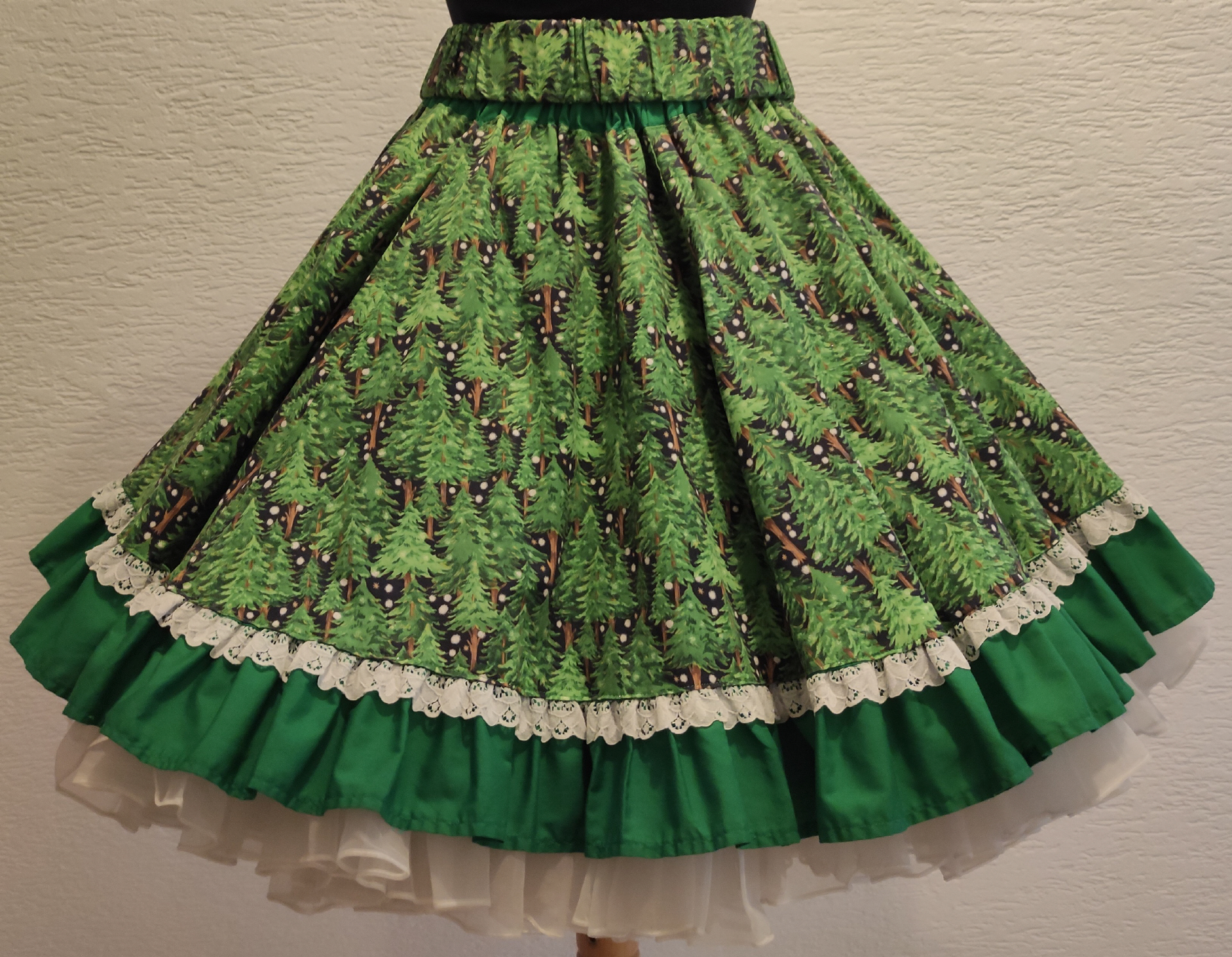 weitschwingender Tellerrock in 6 Bahnen mit Tannenbäumen und schwarzen Schneeflocken auf dunklem Untergrund