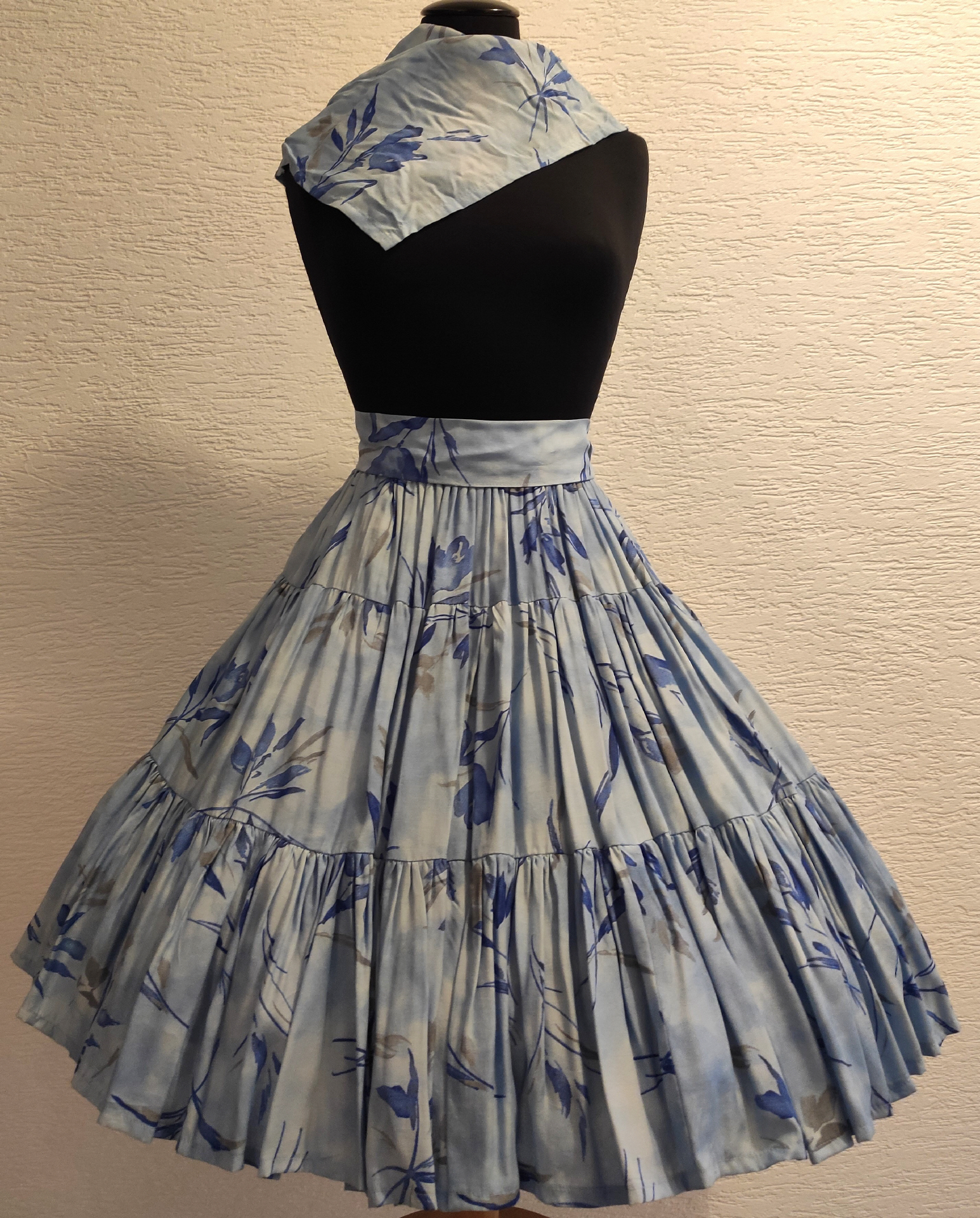Sehr aufwendig verarbeiteter 3-Stufenrock mit dunkelblauen und zart braunen Blüten