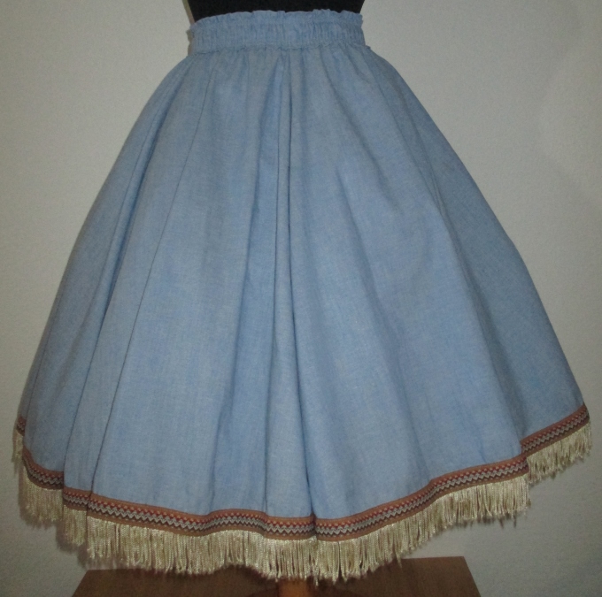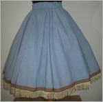 Bahnenrock in hellem jeansblau.Unten mit brauner Borte verziert.Gummibund