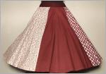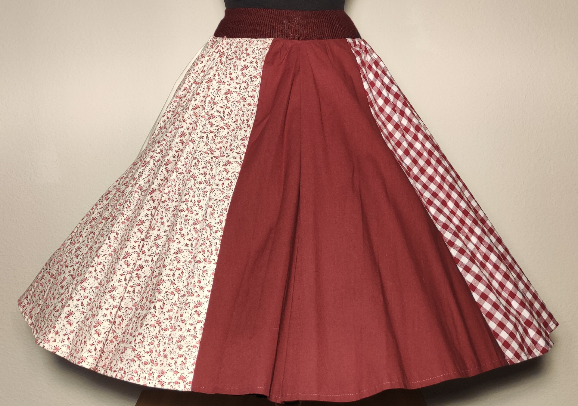 sehr weitschwingender Tellerrock in 8 verschiedenen Bahnen2x dunkelrot2x dunkelrot- weiss Karo in 1x1 cm Größe2x weiss2x weiss mit zartem Streublumen- RosenmusterOben ein dunkelroter Strickbund: 5 cmguter Zustand!