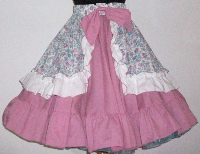 dazu gehört ein Überrock (Apron) weissgrundig mit Blütenmuster in den Farben purple-altrosa-petrol 9 cm breiter weisser Volant breite altrosa Schleife (29 cm)