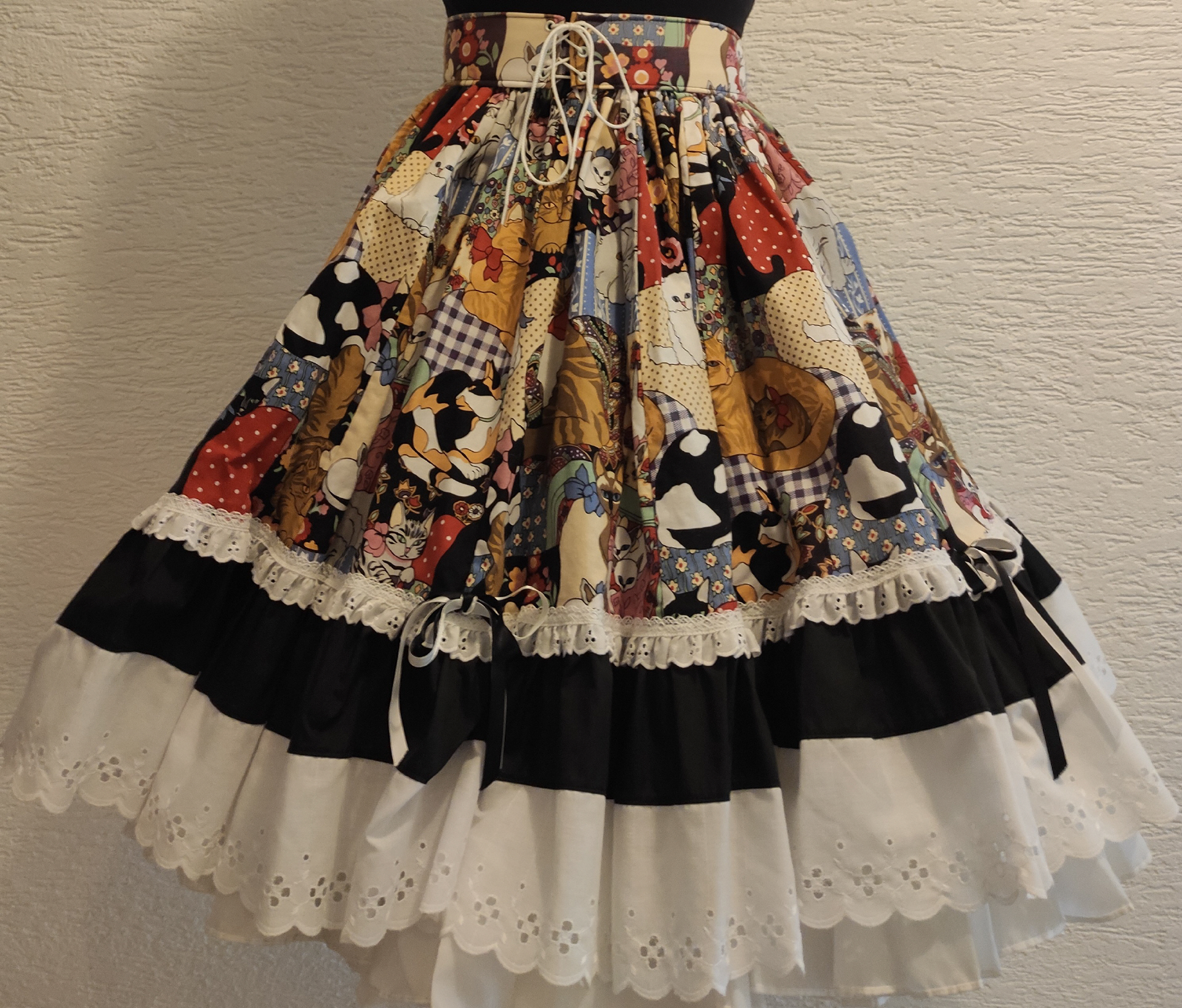 der Rock hat einen angebrachten Gürtel der vorne zugeschnürt wird abgebildet sind verschiedene Katzen unten ein Volant in insgesamt 18 cm Breite davon 9 cm schwarz und 9 cm weiss gewählter Abschluss mit Lochstickerei oberhalb des Volant eine weisse Zierspitze in 2,5 cm Breite den Rock zieren 4 schwarz weisse Satinbändchen