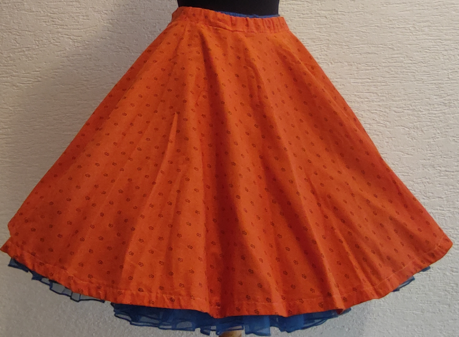 weitschwingende identische (Größe nicht) orangene Tellerröcke mit Blumenmuster1x KinderrockLänge: 54cmBund: 30cm1x für ErwachseneLänge: 54cmBund: 70cmguter Zustand!