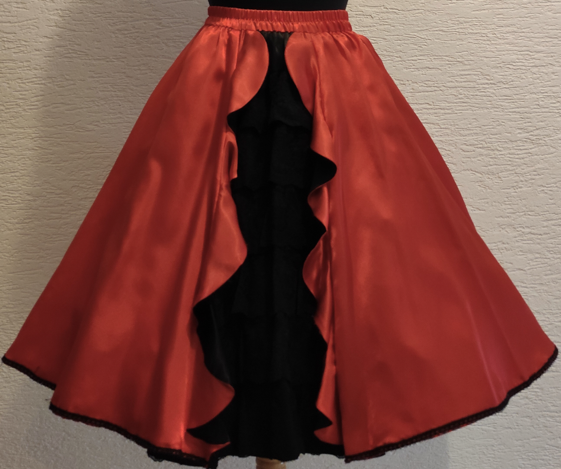 satinartiger glänzender roter Stoff mit schwarzem Spitzeneinsatz der Rock hat vorne einen Einsatz mit schwarzer Spitze, dieser Einsatz hat oben eine breite von 13 cm und unten 53 cm die Spitze in 9 cm Breite ist ziegelförmig übereinander genäht das ganze ist eingefasst mit 6 cm breiten wellenförmigen Volants, außen rot innen schwarz