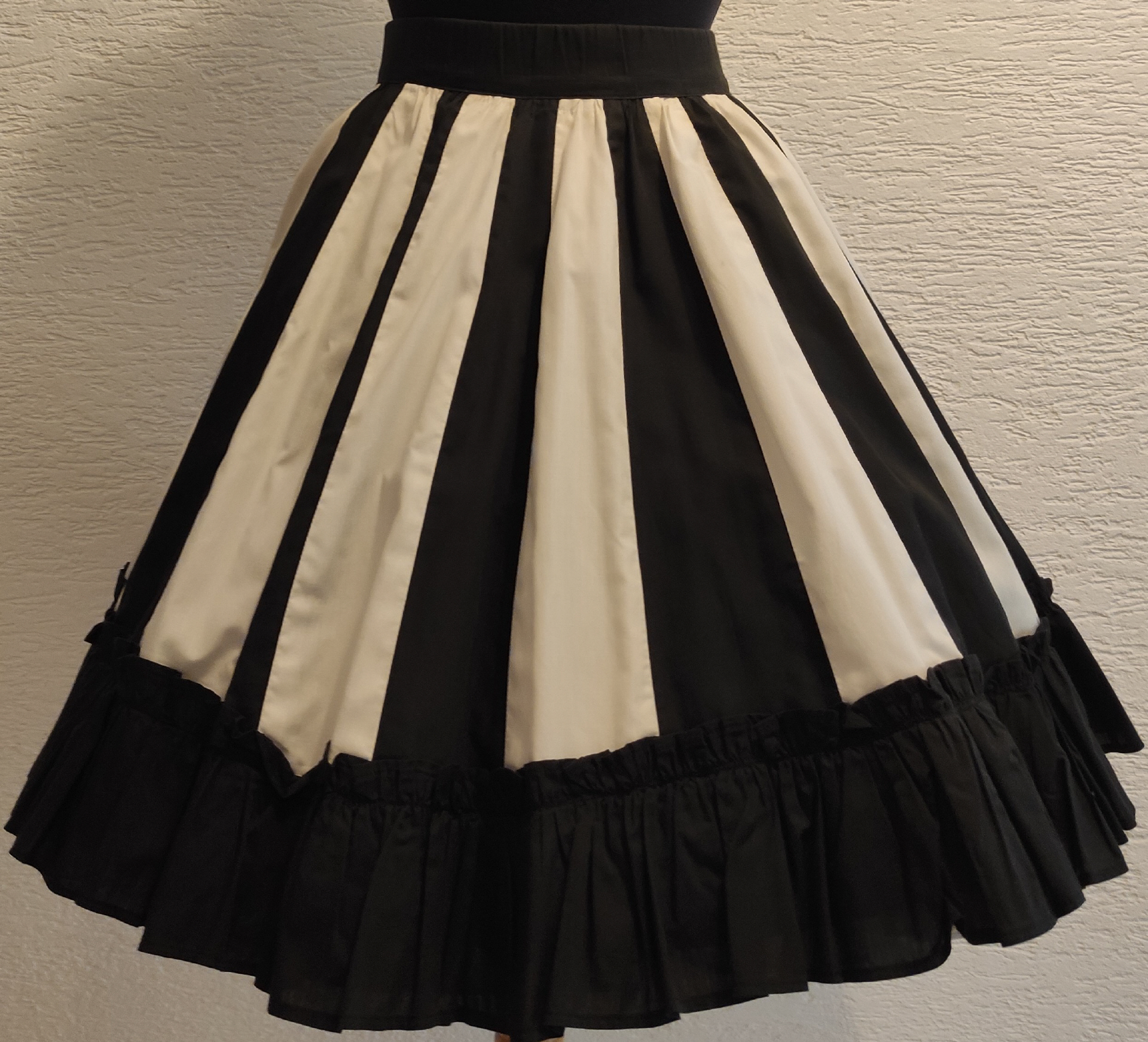 schwarz weisser Rock in schmalen Bahnen unten mit 13 cm Volanthinten 18 cm Reisverschluss sehr ausladendGummibund in 3 cm Breite