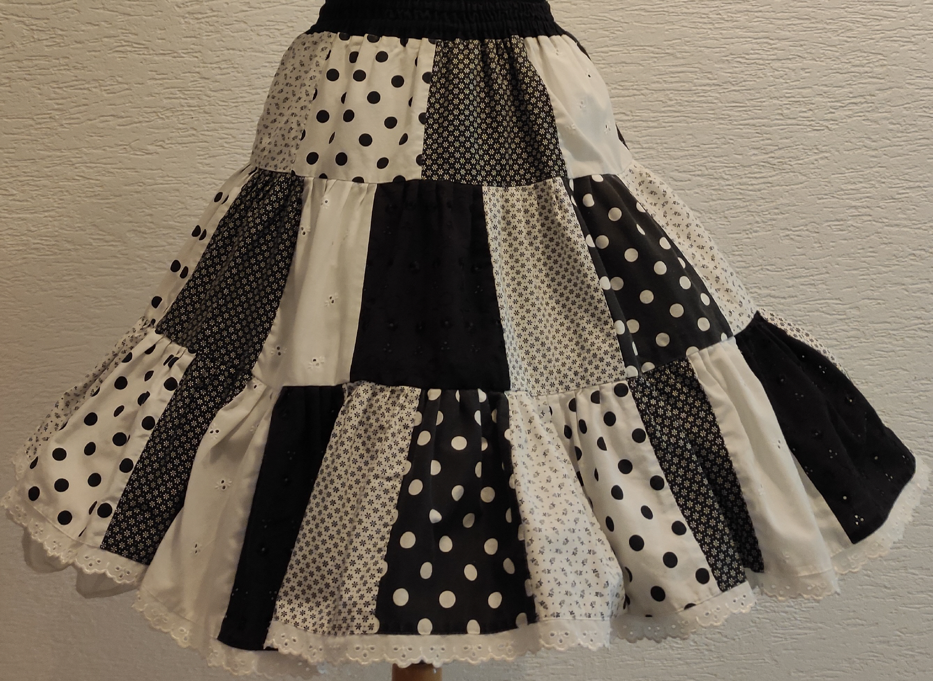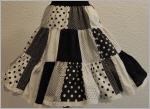 schwarz-weisser 3- Stufen Patchworkrock die Patches sind in weiss mit schwarzen Tupfen, grau mit zarten weissen Blüten, weiss mit Lochstickerei, grau mit weissen Tupfen, weiss mit zarten Blüten, schwarz mit Lochstickerei