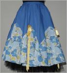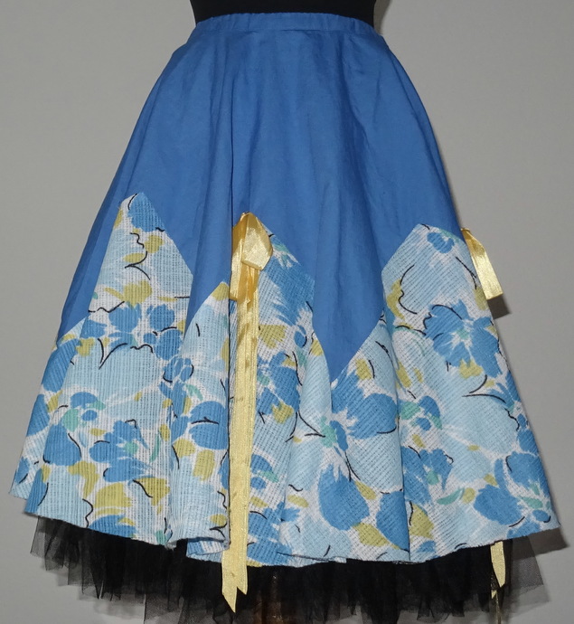 weitschwingender Tellerrock in taubenblauunten geblümtes Muster verziert mit gelben Schleifen2 cm breiter Bund der an der Seite mit einem Band gebunden wirdMaterial:Mischgewebeguter Zustand