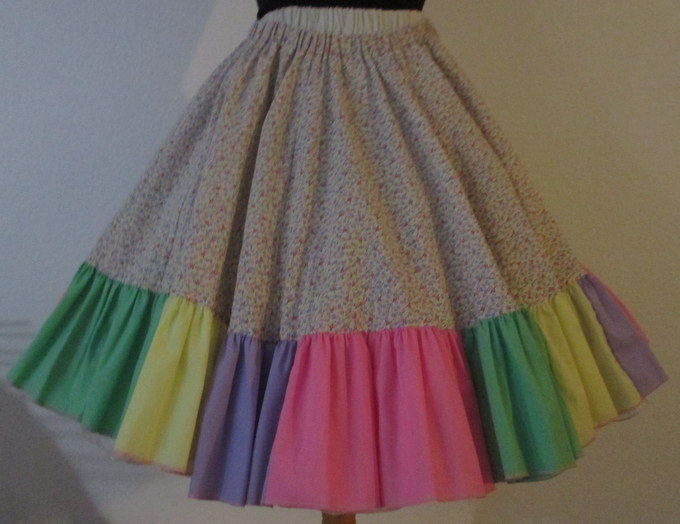 Tellerrock mit Streublumenmuster 16 cm langer Volant in Regenbogen FarbenGummibundMaterial: MischgewebeNEU