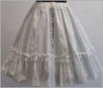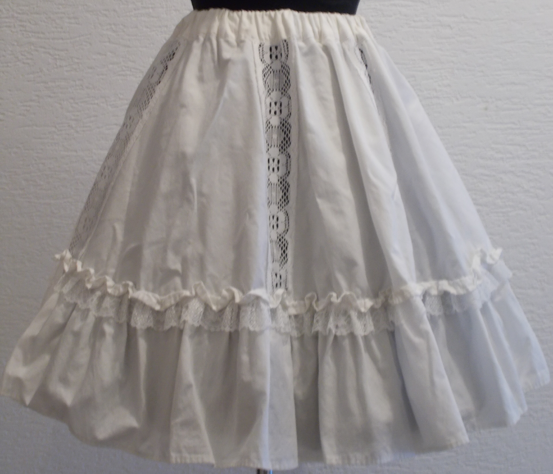 weisser Baumwollrock in Bahnen mit weisser Spitze unten 17 cm langes Volant, ebenfalls verziert mit 4 cm breiter Spitze4 cm breiter Gummibundguter Zustand!