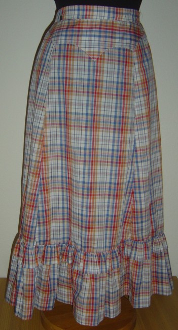 karierter Prairie-Rockin den Farben blau-rot-weiss-hellbraunvorne starrer Bund und aufgenähter Sattelhinten Gummibund18 cm breites Volant über dem ein weiteres 5 cm breites Volant istNeu 65% Polyester, 35% Cotton