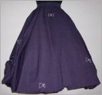 lilafarbener, weit schwingender Tellerrrock vorne mit Kellerfalte ringsum bestickt mir kleinen Schleifen aus silberfarbenen Perlen fixer Bund hinten Reissverschluss an den Seiten ist der Rock mit einem lila Samtband gerafft und mit jeweils 3 Straßsteinen bestickt