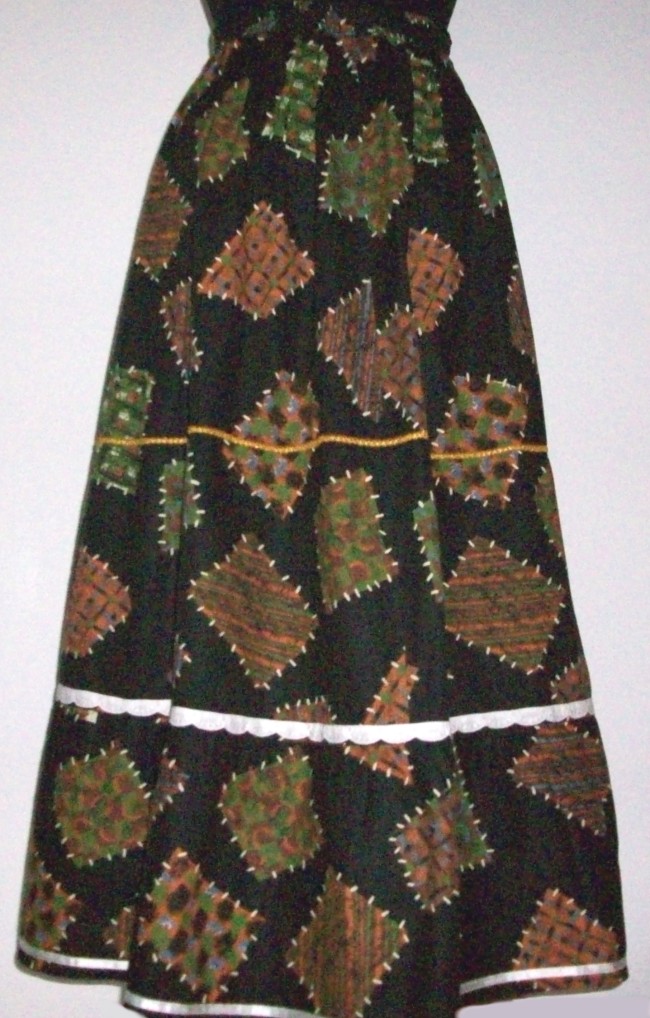 langer SD-Rockschwarzgrundig mit Vierecken in verschiedenen Farben23 cm Volant mit weisser Spitze und weissem SatinbandGummibundguter Zustand
