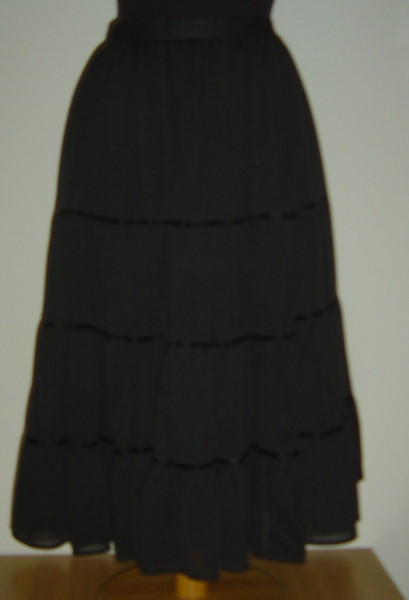 schwarzer 4-Stufen-Rock in Grösse 36zwischen den einzelnen Stufen ist ein schwarzes Satinband aufgenähtder Rock ist komplett gefüttert100% Polyester (pflegeleicht)hinten 19 cm Reisssverschlussguter Zustand