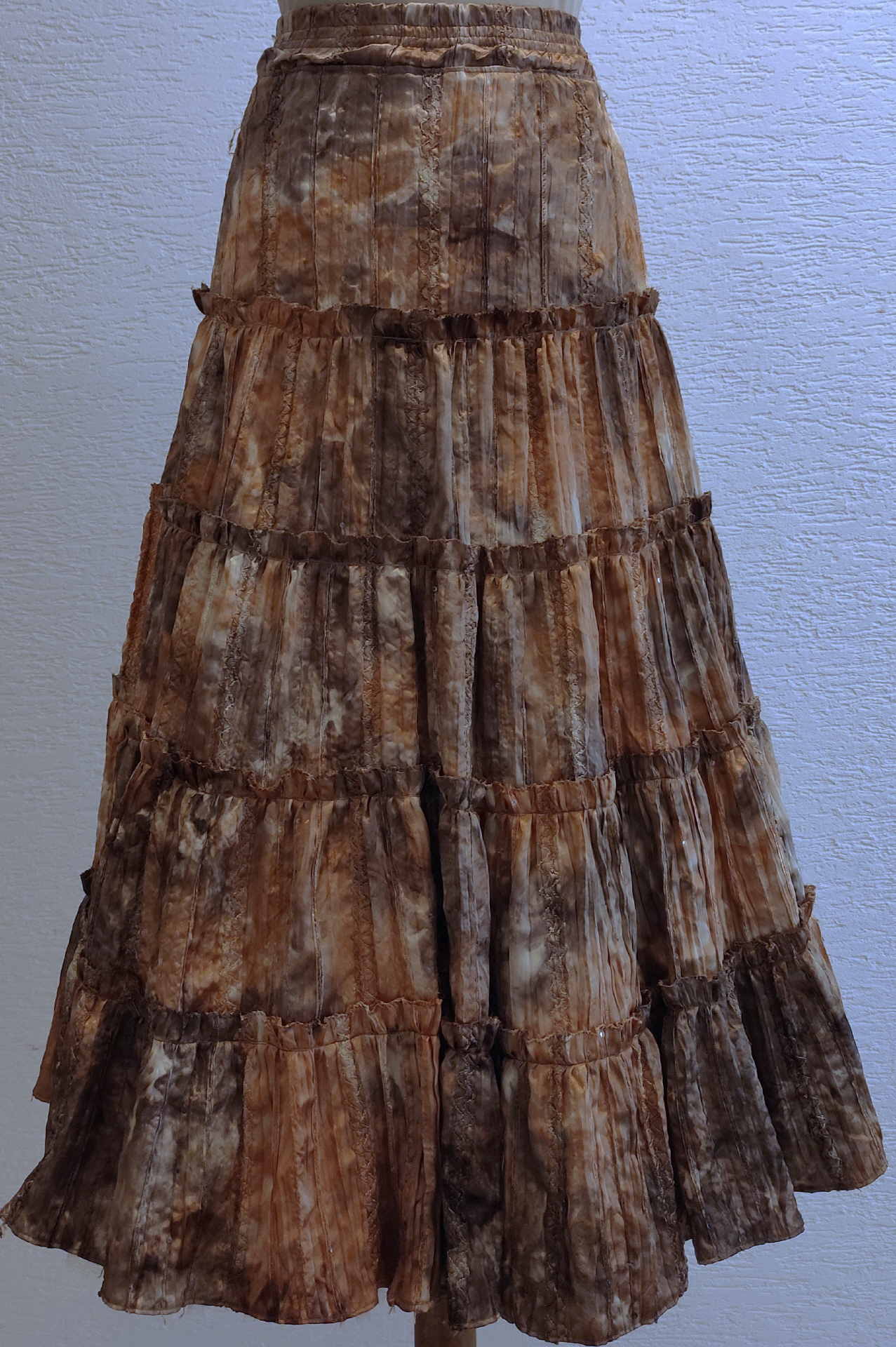 langer schimmernder Prärierock in brauntönenpflegeleichter Stoff, zwischendrin immer wieder eingestickte Elementeseersuckeroptikin 5 Stufen 5 cm breiter Gummibund guter Zustand