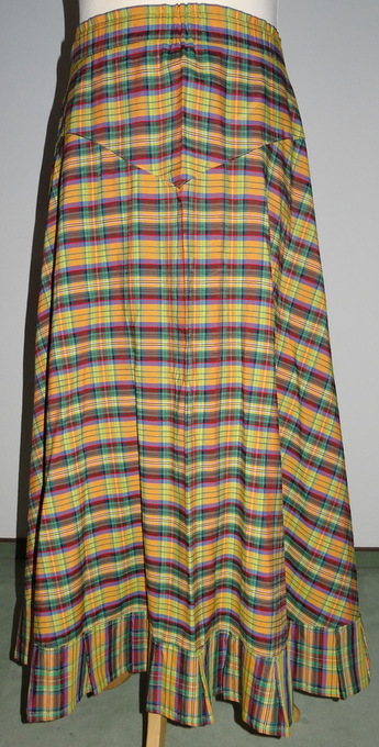 bunt karierter langer Rock in den Farben gelb, grün und pflaume