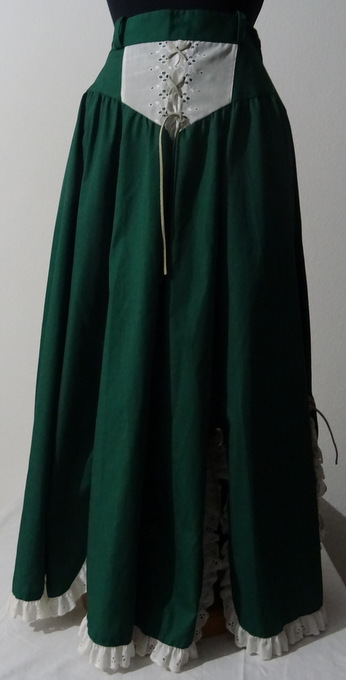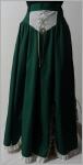 langer jägergrüner Bahnenrock unten sind die Bahnen gebogen und haben jeweils einen 25 cm langen Schlitz, verziert mit 2 cm breiter weisser Spitze mit Lochstickerei jede Bahn ist verziert mit einem silbernen Concho und hellem Lederband vorne ist der Rock gearbeitet mit einem 14 cm breitem Dreieck aus weisser Spitze und verziert mit hellem Lederband hinten 22 cm langer Reissverschluss 4,5 cm starrer Bund (Bund mit Gürtelschleifen)