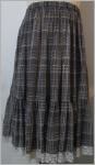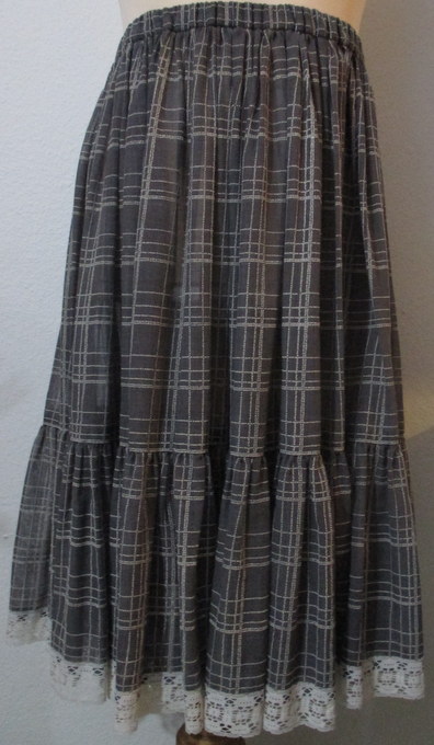 langer grauer Rock mit zartem weissem Karomusterleichter Stoffunten mit 23 cm Volant, verziert mit 4 cm weisser Spitze2,5 cm breiter Gummibundgebraucht, guter Zustand