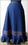 dunkelblauer Jeansrocknur vorne mit wunderschöner Stickerei, hell- und dunkelrosa Blüten und Blätterunten mit 10 cm Volantoben 3 cm breiter Bundhinten als GummibundTOP Zustand