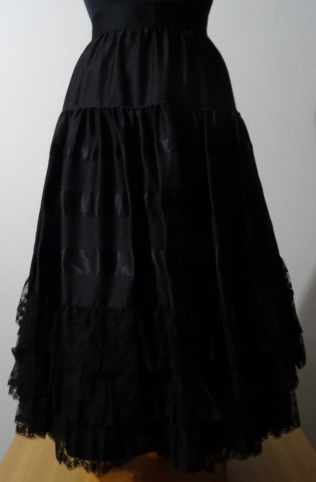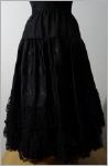 langer schwarzer Rock die obere Stufe beträgt 13 cm, danach fällt der Rock wunderschön weit und ist 3 mal mit einem Satinband versehen nach unten ist der Rock verziert mit 3 mal 10 cm breiter schwarzer Spitze die untere Weite beträgt 236 cm hinten 21 cm langer Reissverschluss 4 cm breiter starrer Bund der mit einem Knopf geschlossen ist der Rock ist komplett gefüttert