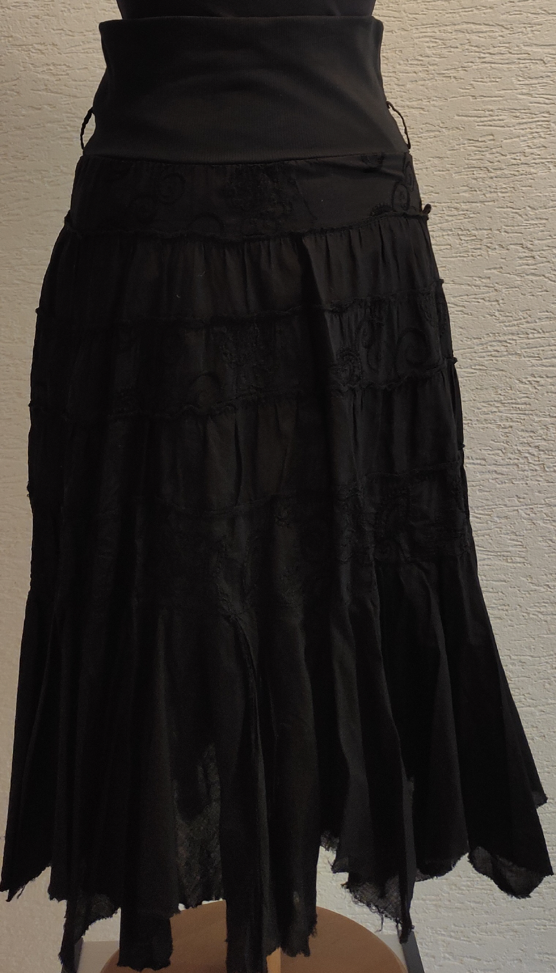 langer schwarzer Rock in 6 Stufenoben 12cm Feinstrickbund mit Gürtelschlaufendie Stufen wechseln ab in besticktem und normalem Stoffunten ist er zipfelig geschnittender Rock ist zur Hälfte gefüttert100% Cotton made in Italyguter Zustand