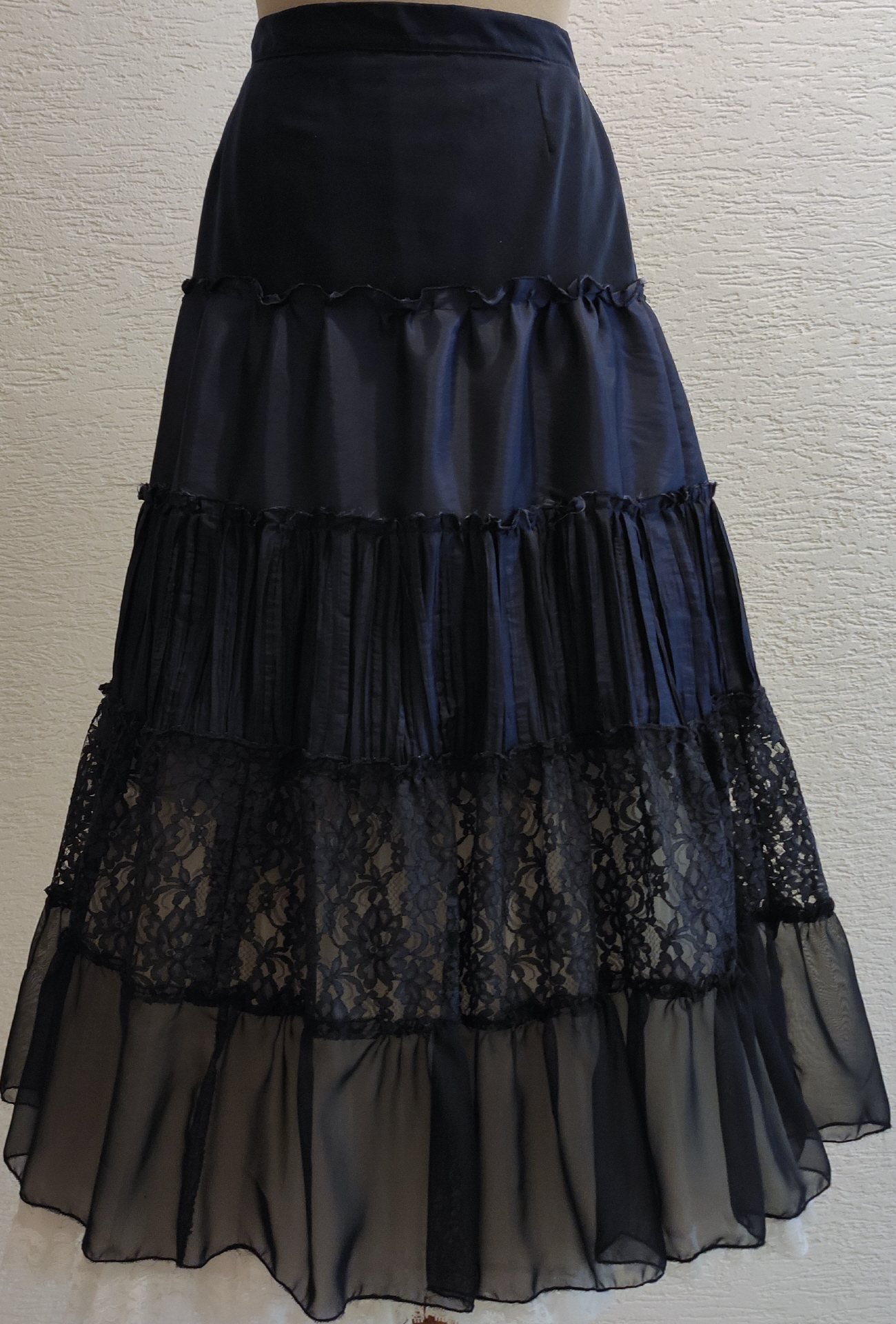 langer dunkelblauer Rock in 5 Stufen pflegeleichte Stoffe, die Stufen sind aus Materialmixen in dunkelblauen Tönen 3te Stufe ist in Krinkeloptik, 4te Stufe dukelblaue Spitze und die unterste Stufe Chifffon