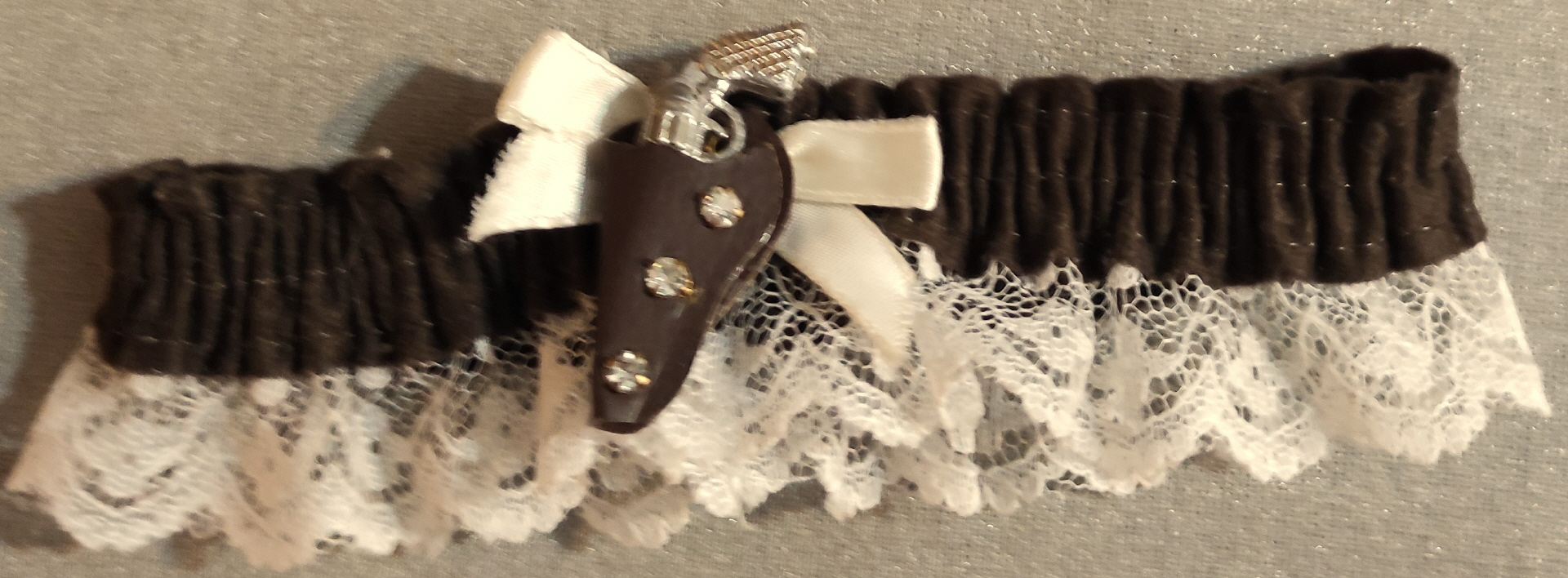 braunes Strumpfband mit weisser Spitze, weisses Schleifchen und aufgenähtes Pistolenhalfter mit PistoleBreite: 4 cm Dehnbar von 32 cm bis 42 cm guter Zustand!