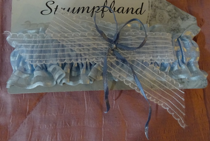hellblaues Organdy-Strumpfbandverziert mit weissem Organdyschleifchen und hellblauem schmalem SatinschleifchenNeu