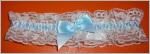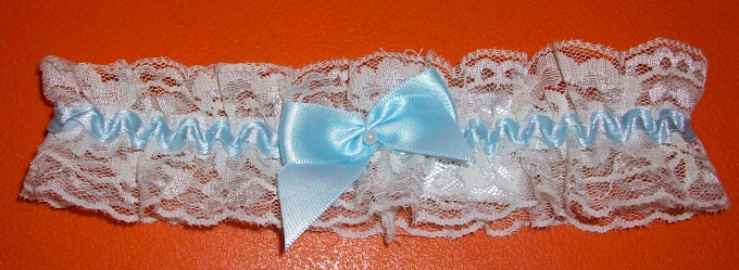 Strumpfband aus weißer Spitzemit hellblauem Satinbandund hellblauem SchleifchenNeu