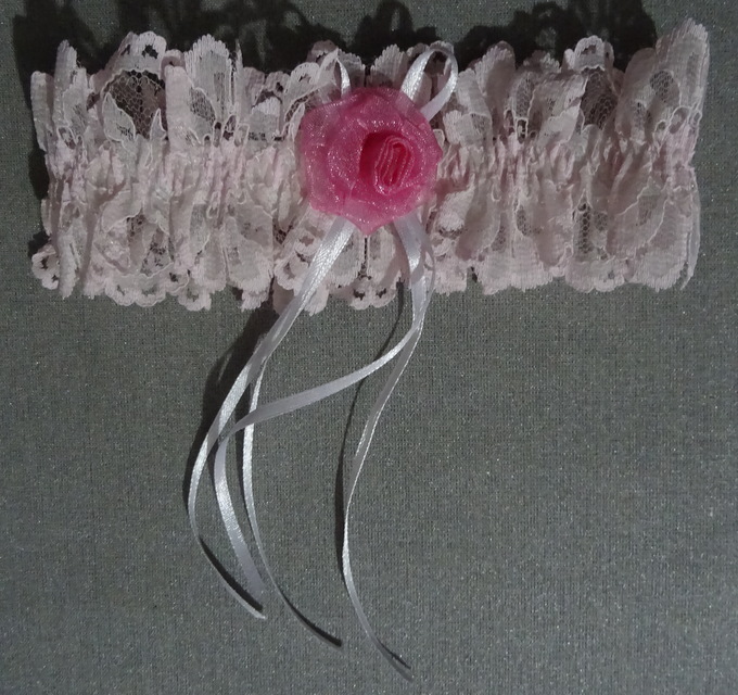 Strumpfband aus zartrosafarbener Spitzemit wunderschöner rosafarbener Organdy-Rose und weissem SatinschleifchenNEU