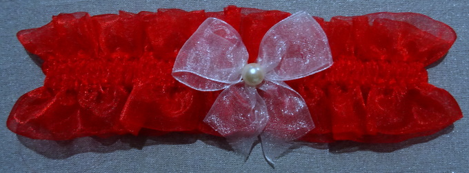 Strumpfband aus edlem rotem Organdymit weissem Organdy-Schleifchen und weisser PerleNEU