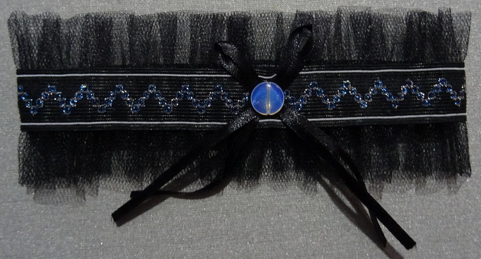 Strumpfband aus edlem schwarzem Netdas Gummiband in der Mitte ist mit blauem Zick-Zack Muster, schwarzem dünnem Satinschleifchen und blauem Stein verziert2x vorhandenNEU