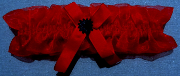 Strumpfband aus edlem rotem Organdymit rotem Satin-Schleifchen und schwarzer BlüteNEU