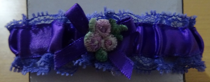 Strumpfband aus lilafarbener Spitze und lilafabenem Satinbandverziert mit lilafarbenem Satinschleifchen und 3 gestickten BlütenNEU