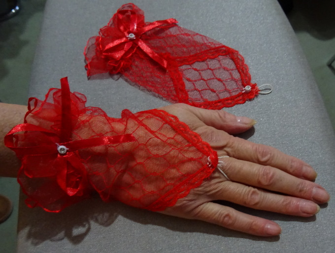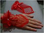 fingerlose Damenhandschuhe aus roter Spitzemit Ringfingergummiverziert mit Satinschleife und StrasssteinchendehnbarNEU