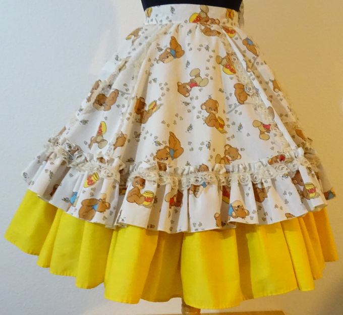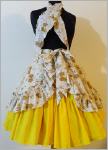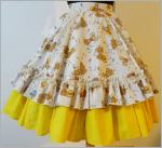Vorne zwei aufgesetzte Taschen, verziert mit beigefarbener Spitze. Unten 12cm-Volant.