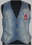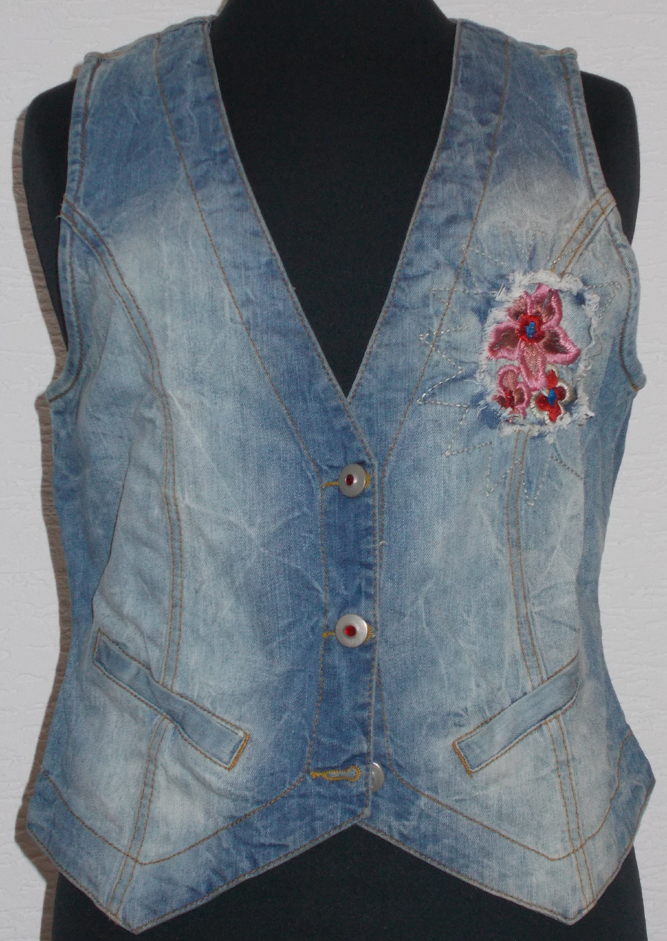 Damen Jeansweste der Marke Amy Vermont Gr. 38unten 2 angedeutete Täschchenvorne geknöpft mit 3 silberenen Knöpfen mit rotem StrassMaterial: 98% Baumwolle2% ElasthanBrustumfang: 94 cm Taille: 82 cmLänge: 52 cm TOP Zustand!