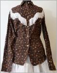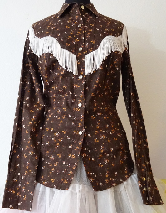 braune Westernbluse mit hellbraunem und weissem Streublumenmustervorne und hinten mit 6 cm langen weissen Fransenmit weissen PerlmuttdruckknöpfenMaterial:MischgewebeNEU
