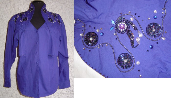 Grösse S Farbe lila Langarmmit aufwändiger Stickerei Perlen und Paillettenleichter Stehkragenvorne geknöpft (Knöpfe stoffbezogen) 65% Polyester, 35% Cotton