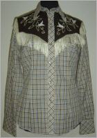 Westernbluse H Bar C California Ranchwear (neu) (WBL-003) Farbe: Karo in braun, rauchblau und beige aufgenähter brauner Sattel mit gestickten Ornamenten im... 45,00 EUR (zzgl. Versandkosten)