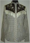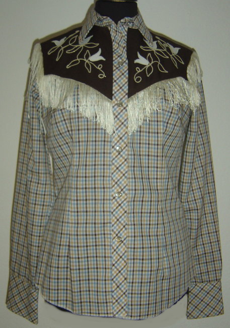 Farbe: Karo in braun, rauchblau und beige aufgenähter brauner Sattel mit gestickten Ornamenten im Vorderteil im Rücken uni braun hinten und vorne mit Fransen silber gefasste Perlmuttdruckknöpfe, ebenso an den Ärmeln Grösse XS