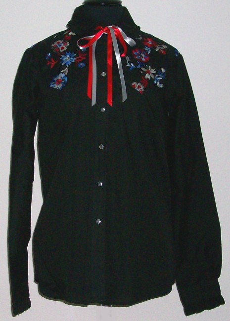 schwarze Bluse vorne und hinten bestickt mit blau-rot-weissen Blüten und Ranken rot-silbernes Satinschleifchen weisse Perlmuttdruckknöpfe am Kragen und an den Ärmeln ein kurzes Volant