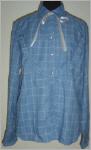 Farbe blau (ins rauchblau gehend) Karos Webart glatt und gebrochen vorne und hinten aufgesetzter Sattel im Vorderteil mit Rüsche am Halsausschnitt ein hellgraues und ein weisses Satinband weisse Perlmuttdruckknöpfe am Verschluss und an den Ärmeln Manchetten mit Rüsche hochwertige Bluse aus Rockmounts Designer Collection US-Grösse 34 (bitte Masse beachten)