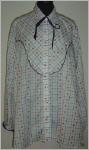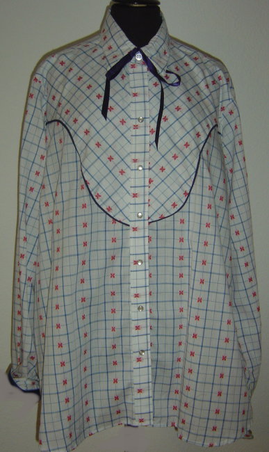Farbe weiss, blaue grosse Karos mit eingestickten, roten X vorne und hinten aufgesetzter Sattel mit blauem Band eingefasst am Halsausschnitt ein dunkelblaues Bändchen weisse Perlmuttdruckknöpfe am Verschluss und an den Ärmeln Manchetten- und Krageninnenseite dunkelblau besetzt US-Grösse 44 (bitte Masse beachten)