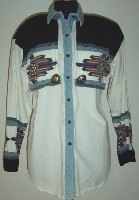 Farbe weiss mit jeansfarbenem Kragen und Knopfleiste aufgesetzter Sattel (nach unten offen) in schwarz mit Indianermuster vorne mit 2 Conchos verziert im unteren Bereich der Ärmel wiederholt sich das Muster des Sattels (mit Schulterpolstern) Grösse Small