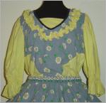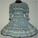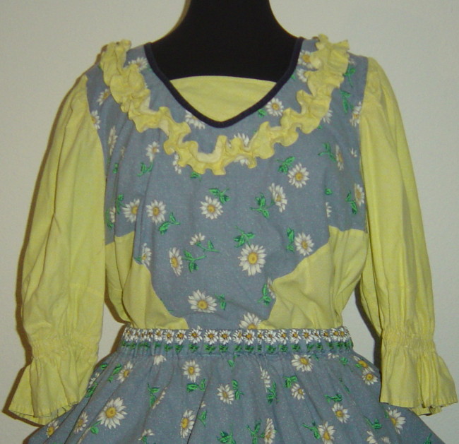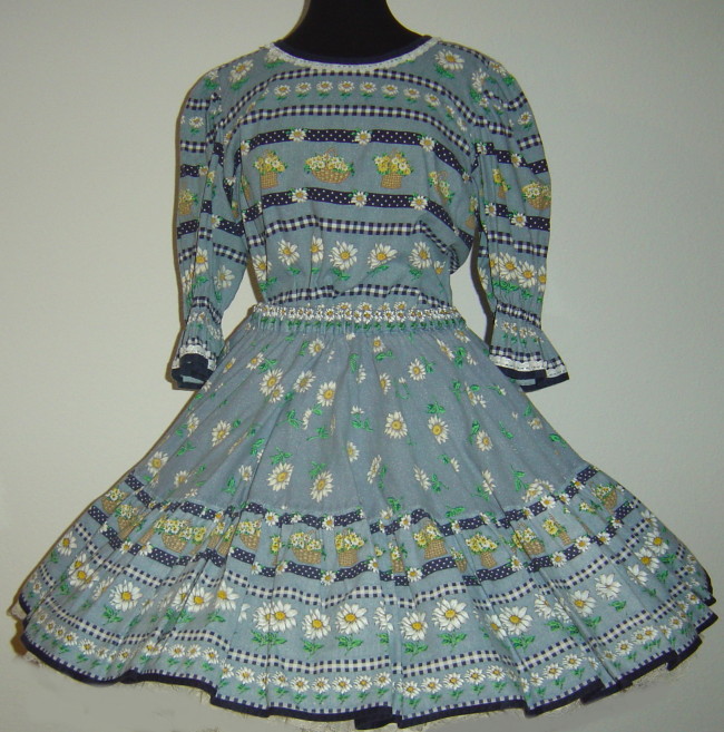 ebestehend aus Rock, zwei Blusen und passendes TäschchenGrundfarbe taubenblau und gelbBluseGrundton taubenblau mit Maragithen-Muster (siehe Foto)kurze Puffärmel mit Gummizug am Halsausschnitt und an den Ärmelchen mit weisser Spitze verziertTeller-Rockmit Gummibunddas Gummiband lässt sich variierenVolant 24 cm breitansonsten ist der Rock in Farbe und Muster passend zu den BlusenSehr guter Zustand