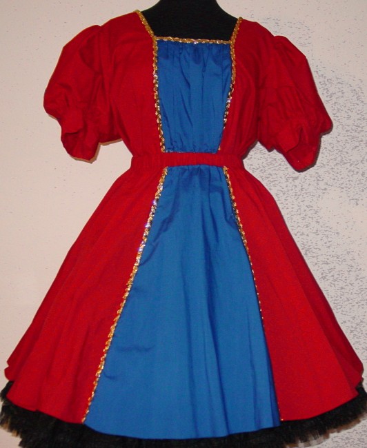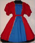 Zweiteiler in sattem Rot und königsblauen Einsätzenverziert mit Goldpailletten-Borte Bluse schöne Puffärmel mit tiefer, blauer Kellerfalte in der Vorderseite königsblauer Einsatzmit Goldpailletten-Borte hinten 35 cm Reissverschluss und zusätzlicher Hakenverschluss Rockmit Gummibund in der Vorderseite königsblauer Einsatz mit Goldpailletten-Borte