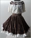 Bluse: runder Halsausschnitt mit Lochstickerei verziert mit 2 mal 2,5 cm breitem braunem Stoffband mit gelb- und orangefarbenem Blumen wie der Rock 32 cm lange Puffärmelchen