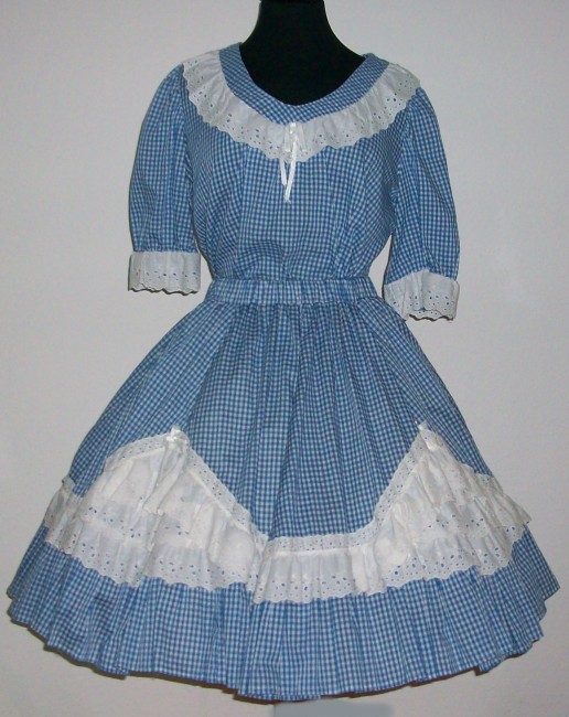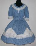 2-Teiler in blau/weiss Karoreich verziert mit weisser Spitze und Lochstickereiabgerundeter V-AusschnittRock in blau/weiss Karounten 17 cm Volantmit Gummibundsehr gut erhalten