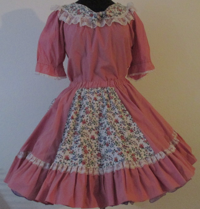 Bluse: runder Halsausschnitt, vorne etwas V-förmig zulaufend mit Schleifchen am Halsausschnitt am Halsausschnitt hat ein sich im Rock wiederholendendes Streublumenmuster umrahmt mit 6 cm weißer Spitze